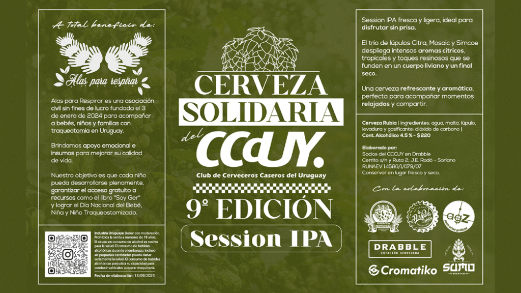 La cerveza de esta edición, la novena, es una Session IPA, aromática y refrescante, elaborada especialmente para la ocasión en la cervecería Drabble, ubicada en la localidad de José Enrique Rodó, departamento de Soriano. Con un perfil cítrico, a frutas tropicales y un toque resinoso, la receta fue creada en colaboración por un equipo de cerveceros caseros y elaborada en la planta cervecera con supervisión técnica de su equipo.